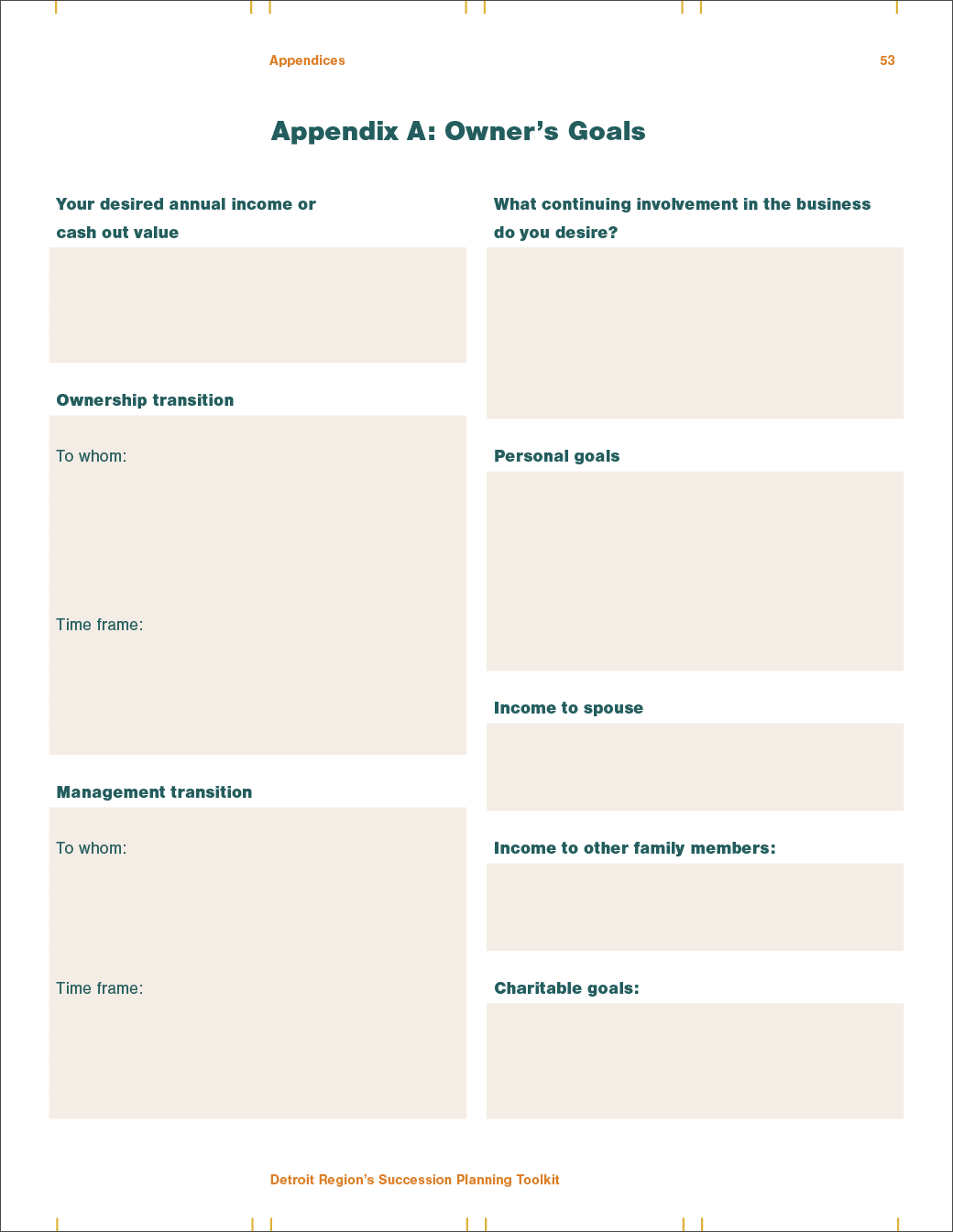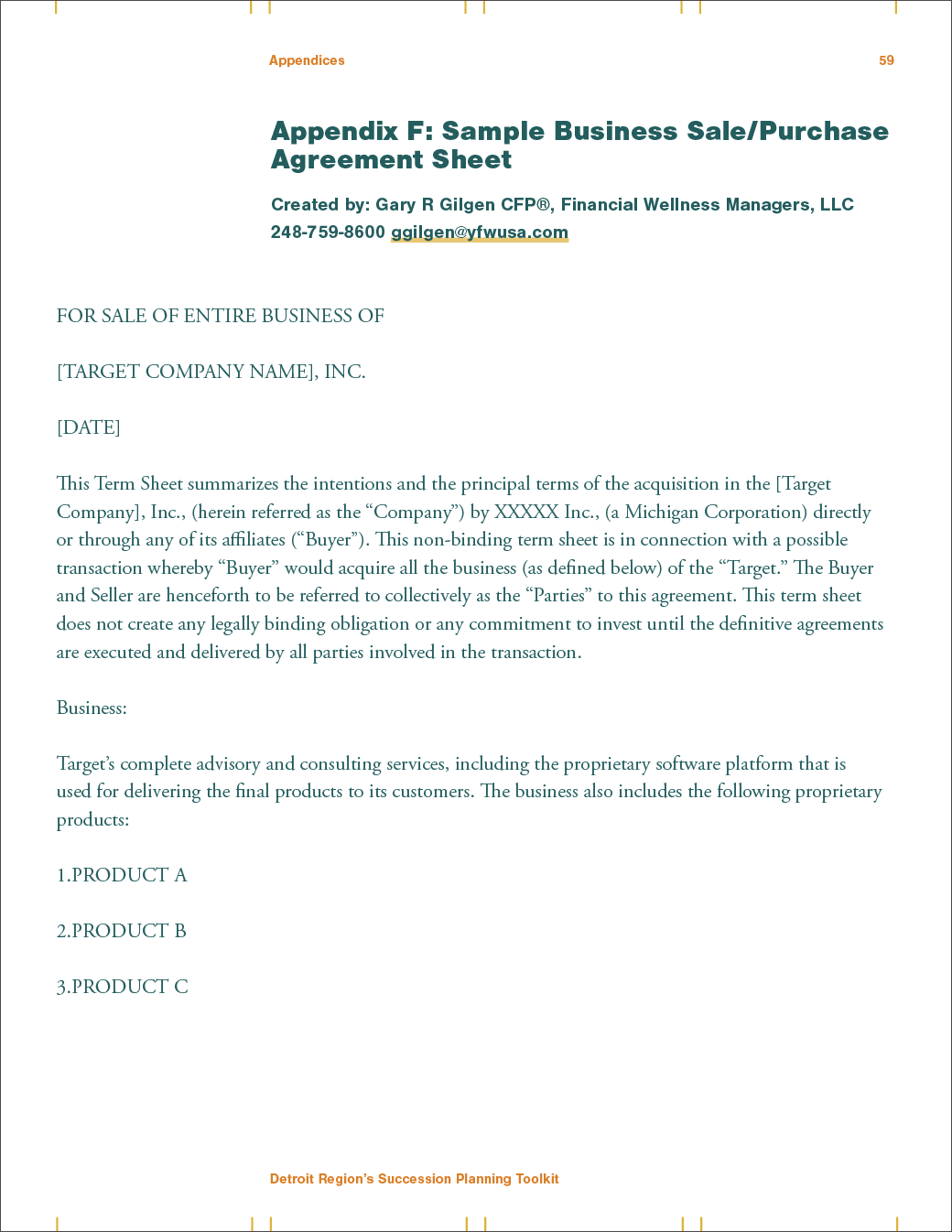 Succession Planning Toolkit Appendices Appendix A: Owner’s Goals Download Appendix E: Future Income Needs Download Appendix B: Needs Planning Download Appendix F: Sample Sale / Purchase Agreement Download Appendix C: Employee Census Download Appendix G: Sample Articles of Incorporation Download Appendix D: Income from Business Download Appendix H: Sample Sections of a Co-Op’s Articles and Bylaws Download